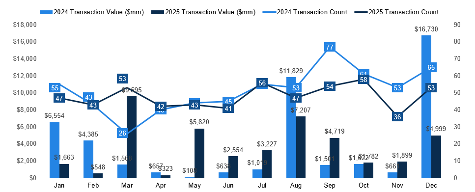 Florida’s M&A market in 2025 reflected one of the most active and diversified transaction environments in the country, with nearly 600 announced deals spanning healthcare, financial services, technology, industrials, real estate, consumer, and infrastructure. Activity was broad-based across Miami, Tampa, Orlando, Jacksonville, Fort Lauderdale, and the Gulf Coast, reinforcing Florida’s position as both an operating hub and a magnet for institutional capital. The year featured multiple landmark transactions, including Clearlake Capital’s $7.39 billion acquisition of Dun & Bradstreet in Jacksonville, Brookfield’s $6.0 billion acquisition of Duke Energy Florida, SoftBank’s $4.3 billion take-private of DigitalBridge in Boca Raton, and Roper Technologies’ $1.85 billion acquisition of CentralReach in Fort Lauderdale. These transactions, alongside a steady cadence of middle-market platform investments, underscore sustained sponsor appetite for scalable, recurring-revenue businesses headquartered in the state.